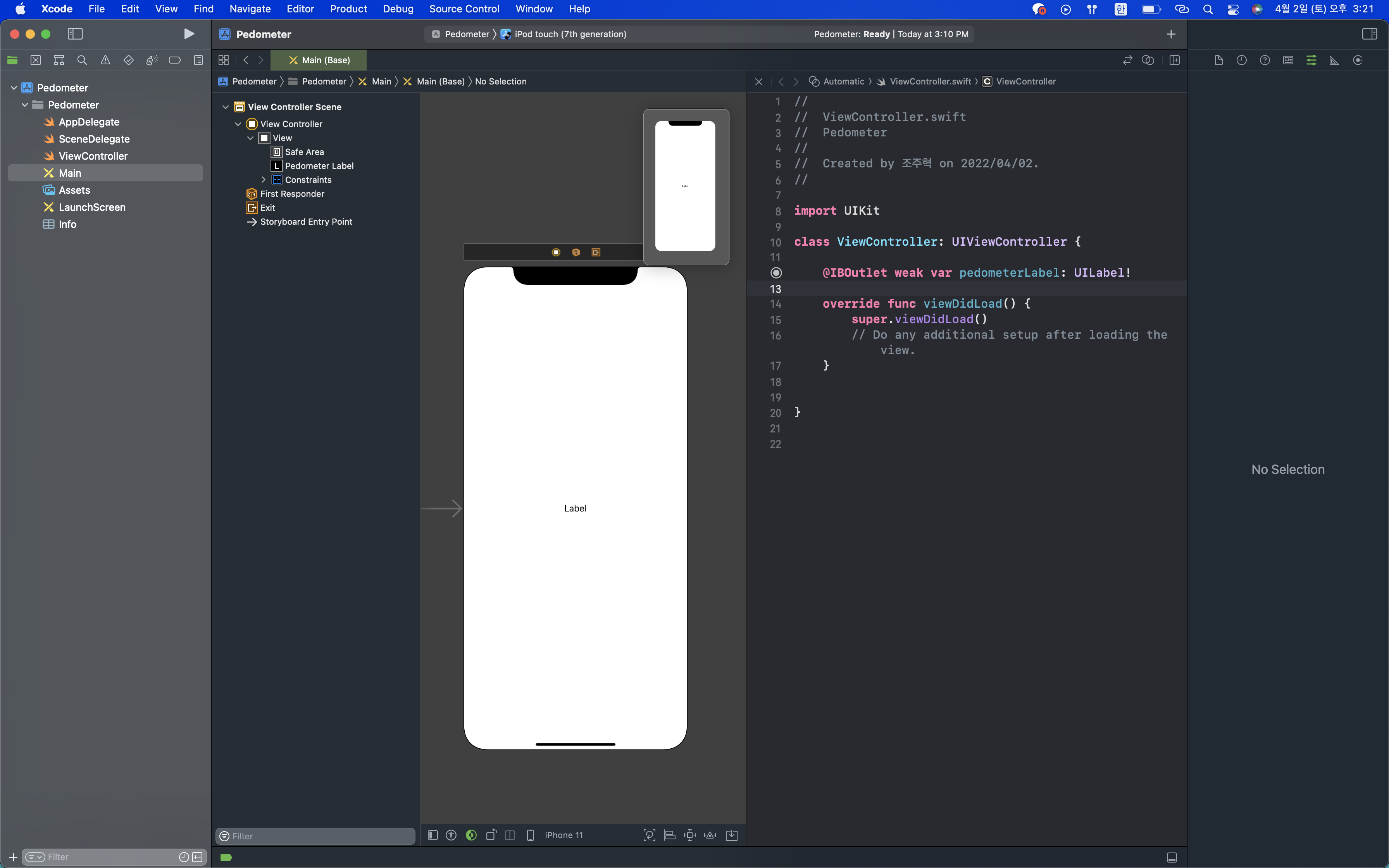UI는 크게 신경 쓰지 않고, 걸음 수만 보일 수 있게 가운데에 UILabel 하나만 놔두겠습니다.